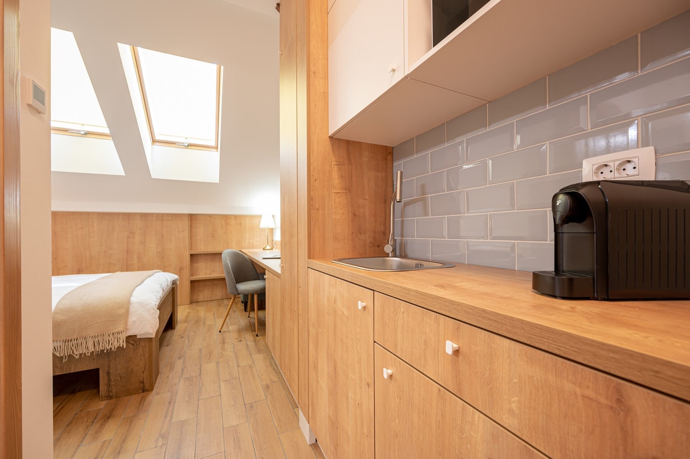 A small kitchenette equipped with a microwave, coffee machine, and kettle is available for your convenience. Just relax and enjoy your stay: coffee and water are on us.