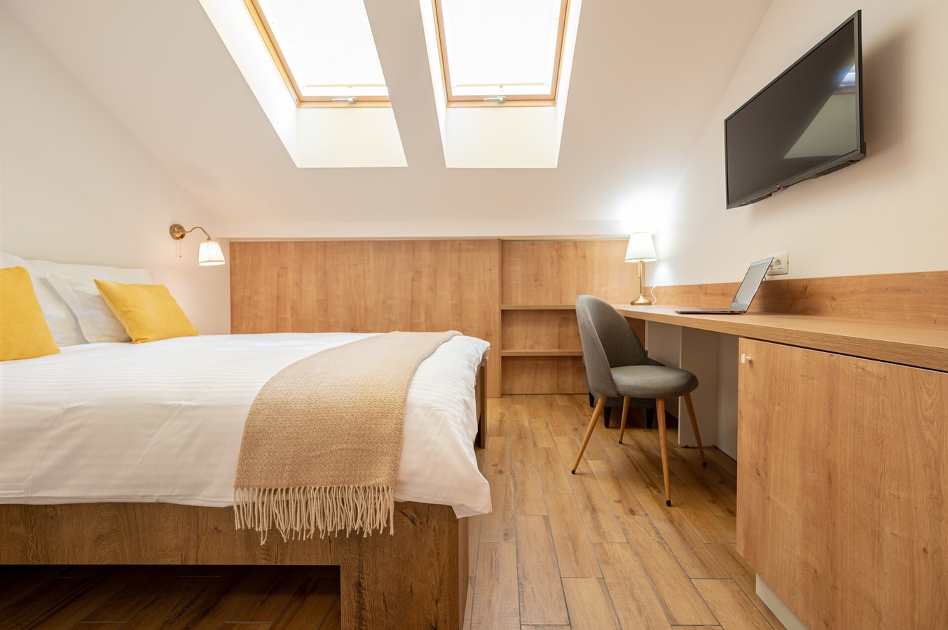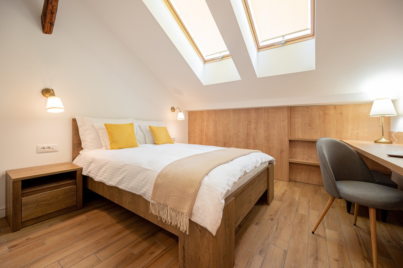 Inside, you’ll find a cozy bedroom featuring a comfortable double bed (140x200 cm), a practical work desk, and a charming lounge chair, perfect for reading or relaxing late into the night.