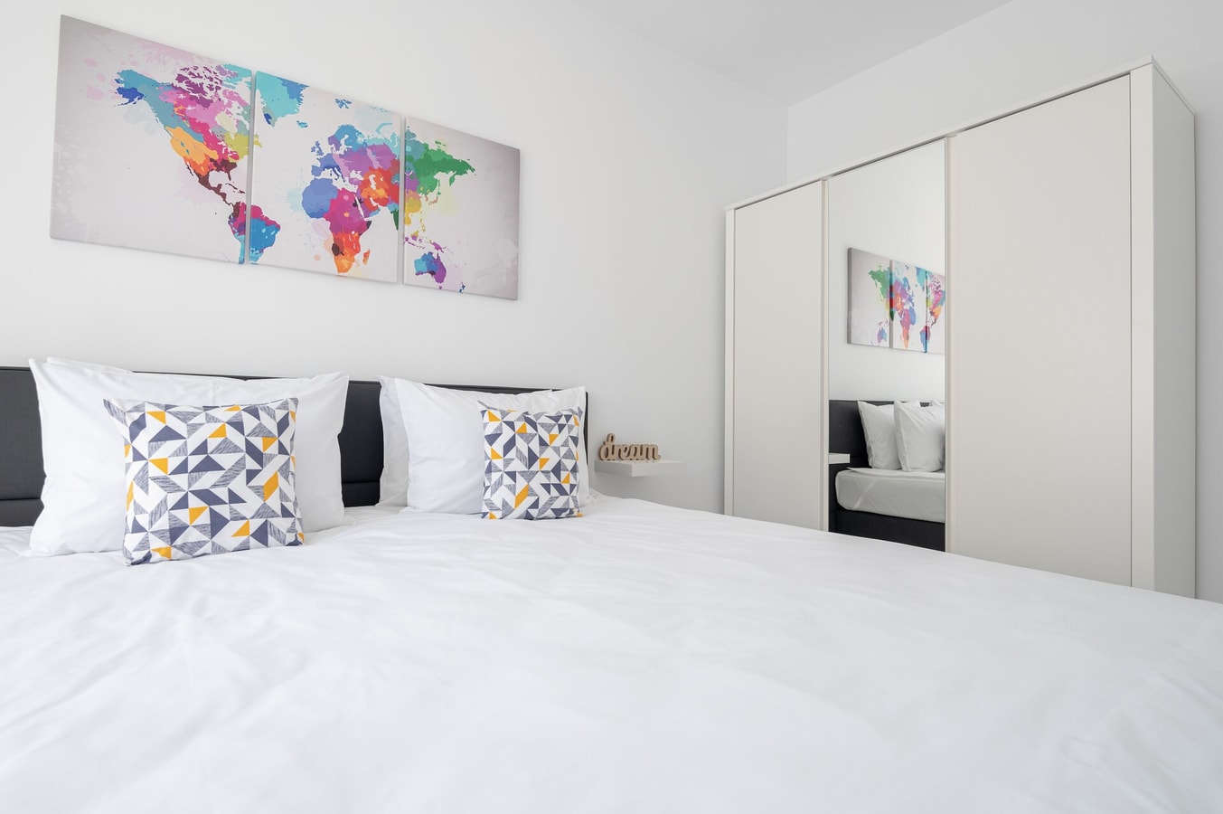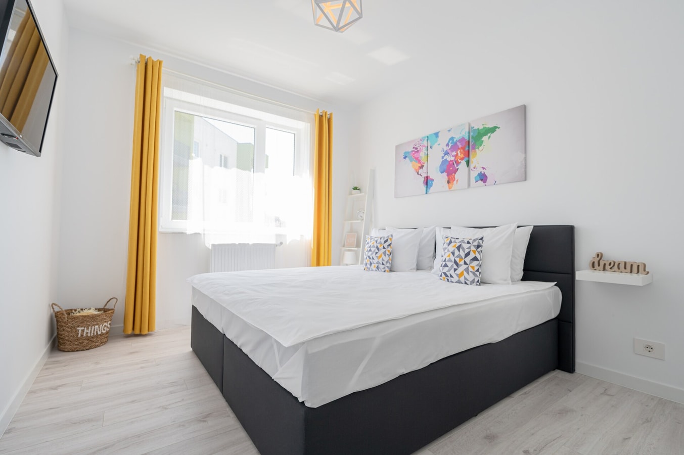 You are welcome to relax and enjoy your stay in our warm apartment, bursting with natural light. A calm design with a few colourful touches creates a perfect mix. Modern and practical appliances will ease your stay. Perfectly located in one of the newest and green residential areas in Oradea, close to the University. Professional cleaning and disinfection protocol. Fast and easy access through the property with a code-based system. Lots of free parking spaces and an outdoor kids play area.