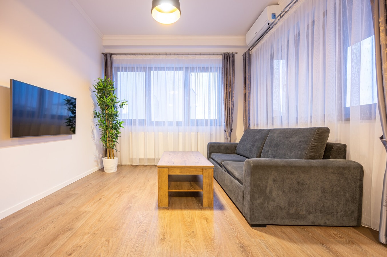 The cozy living room with a Smart TV is the perfect place to relax or enjoy a long conversation with friends over a glass of wine. The modern sofa easily transforms into a double bed, providing extra sleeping space when needed.