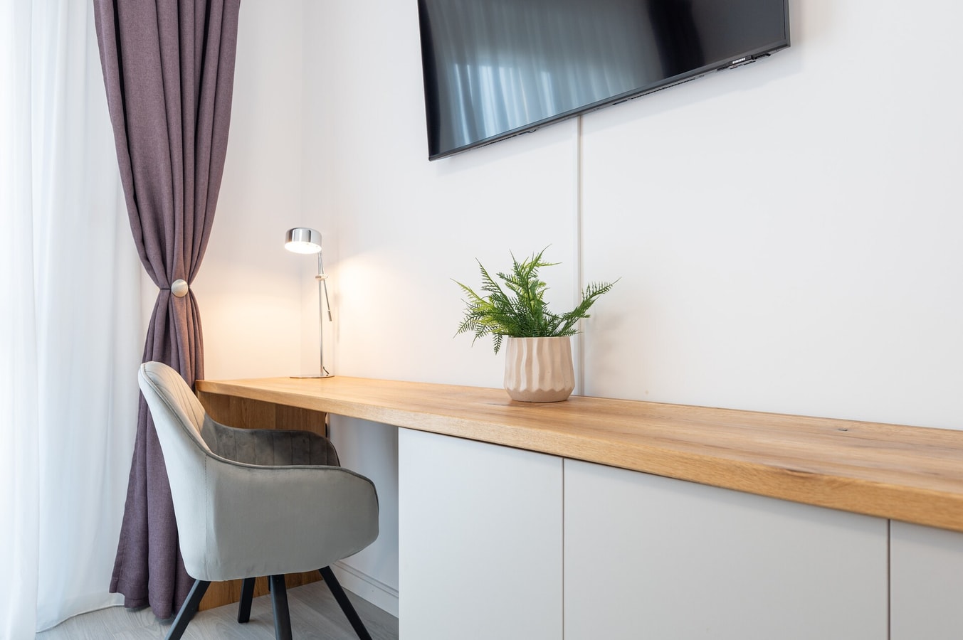 The romantic bedroom, bathed in natural light, features a comfortable queen-size bed, a Smart TV for relaxing movie nights, and a dedicated desk, perfect for guests who need to catch up on work or study in a peaceful environment. The bedroom pairs perfectly with the bathroom, which features a pleasant walk-in shower, ensuring restful nights and refreshing mornings.