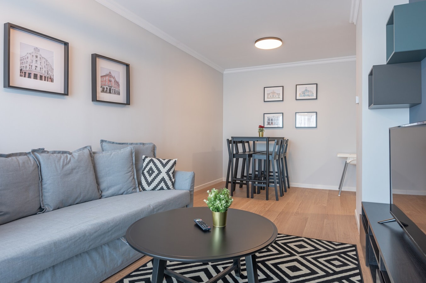 The living room, elegantly furnished, includes a sofa that easily transforms into a comfortable double bed, providing additional sleeping space for two guests.