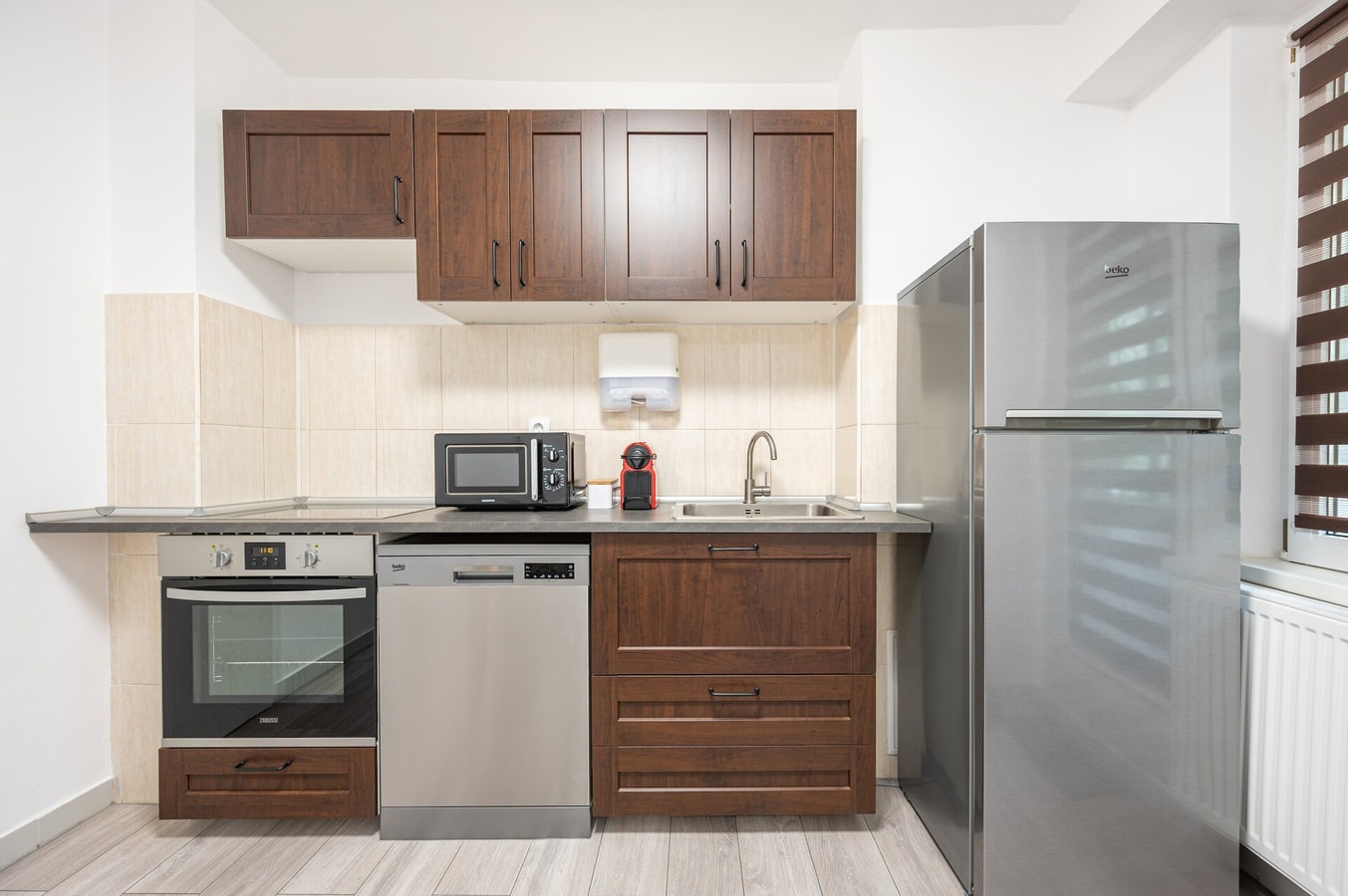 Step into our modernized apartment, located in close proximity to the city centre. Enjoy the convenience of our special preferred parking area, located just beside the building, allowing you to easily park your vehicle without any concerns. We provide a code-based entry system, which means you can enter and exit the apartment at your own convenience, without the need for keys. Rest assured that our professional cleaning team will thoroughly clean and sanitize the apartment before your arrival.