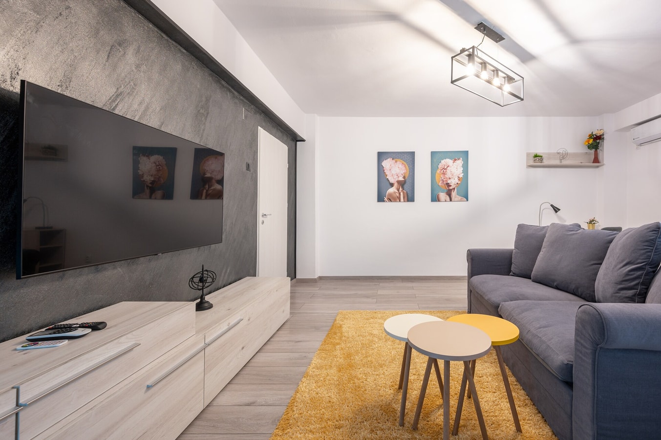 Our apartment offers a cozy and comfortable bedroom complete with a Smart TV, the perfect spot to unwind after a day of exploring the city. The living room includes a comfortable sofa that easily transforms into a double bed, allowing the apartment to accommodate up to four guests in total comfort.
