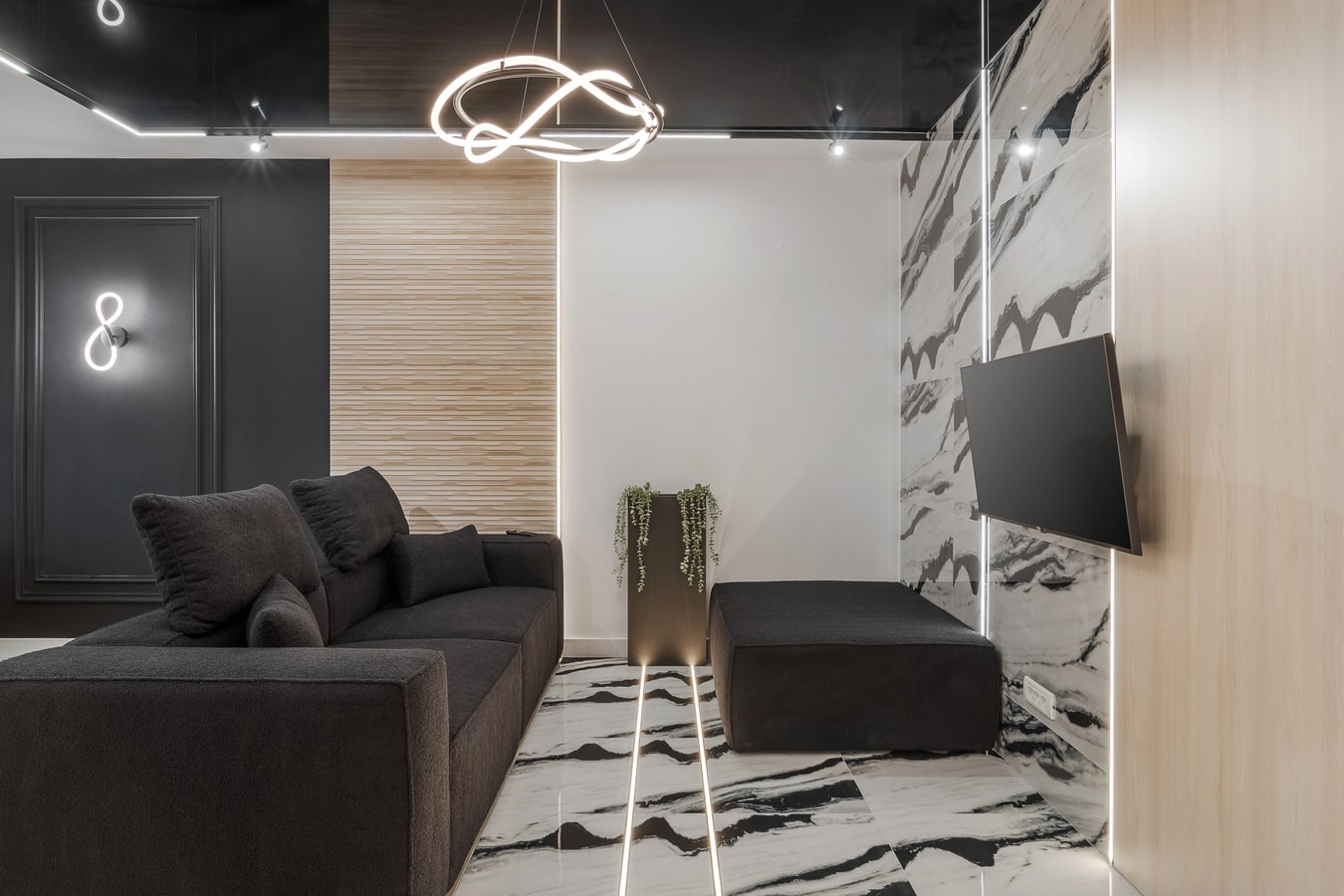 The open-plan living area includes a comfortable sofa, a wall-mounted TV, and a marble accent wall with ambient lighting. Please note that the sofa is not suitable for sleeping.