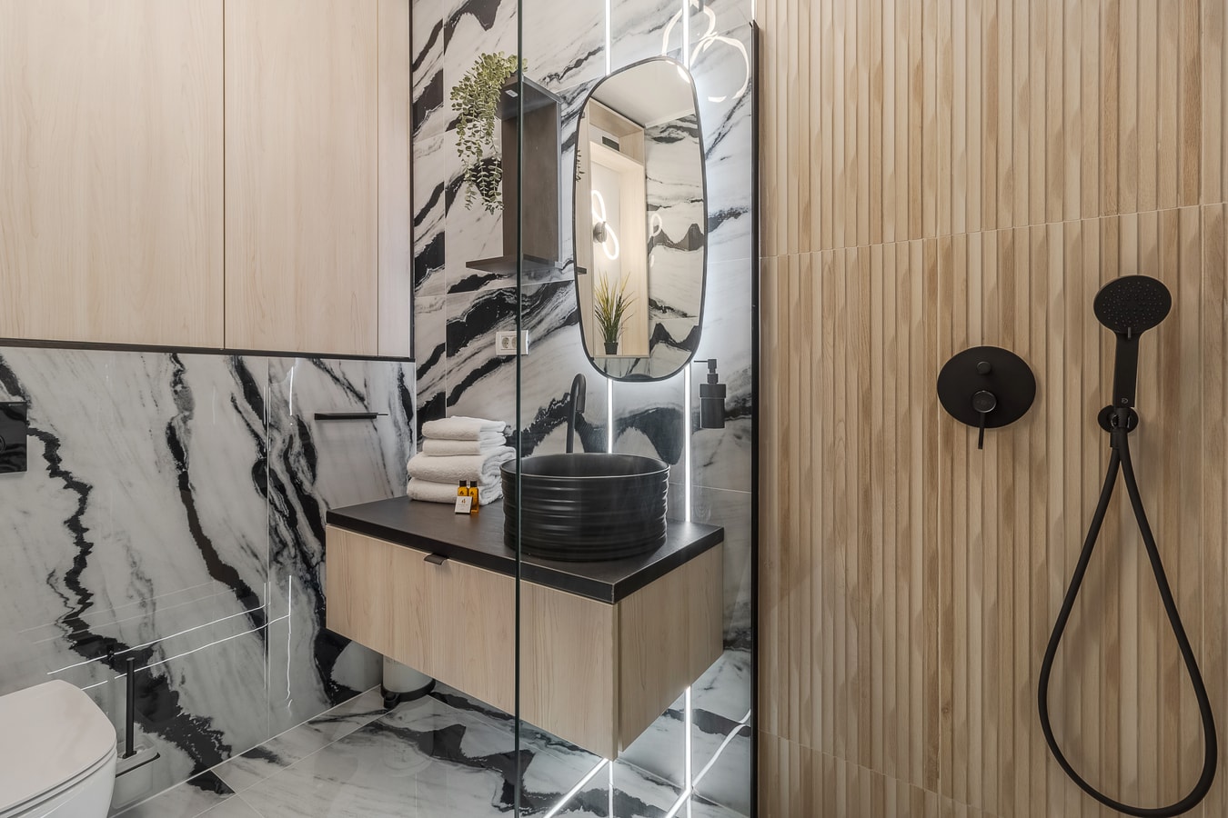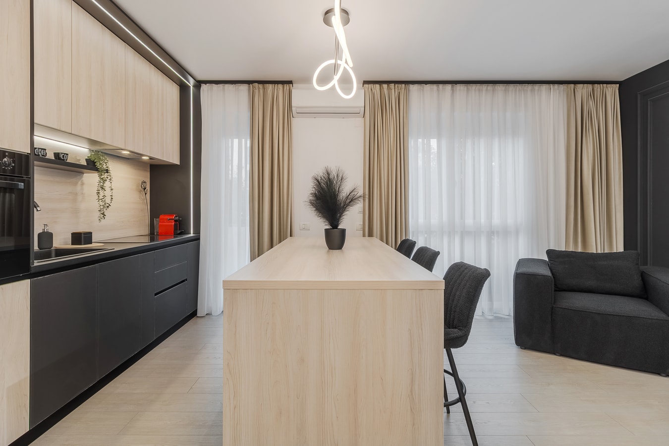 This stylish apartment blends modern design with natural textures, offering a relaxing and elegant atmosphere.