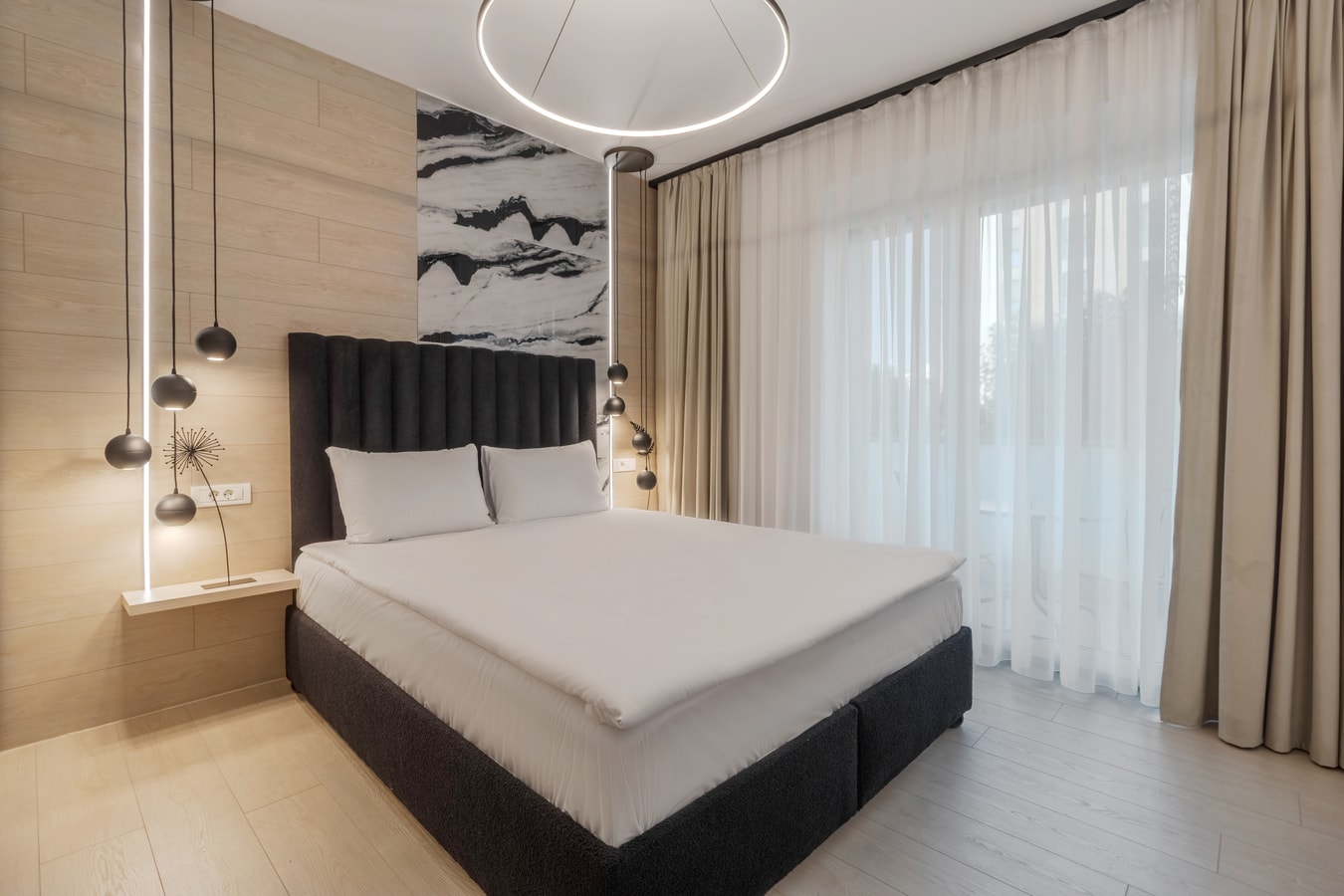 The bedroom features a plush king-size bed with a high upholstered headboard, designer pendant lights, and large windows that open to the balcony. The bathroom is refined with marble tiles, a walk-in shower, and premium finishes.