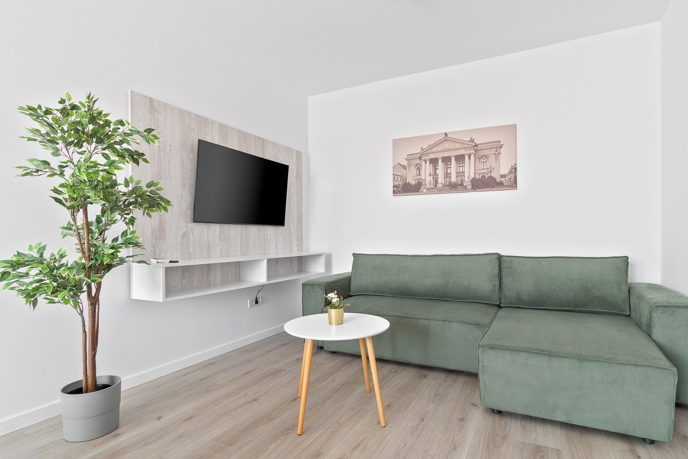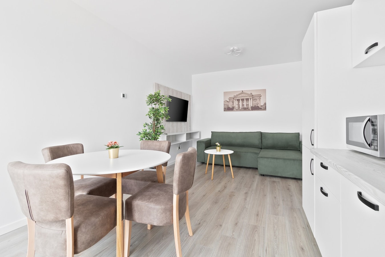 Step into our warm and inviting flat, where modernity and comfort blend seamlessly in a delightful ambiance. Prepare to be enchanted as you take in the picturesque view that greets you upon entry. The contemporary design, accentuated by elegant touches of oak wood, creates a truly inviting space that will make you feel right at home.