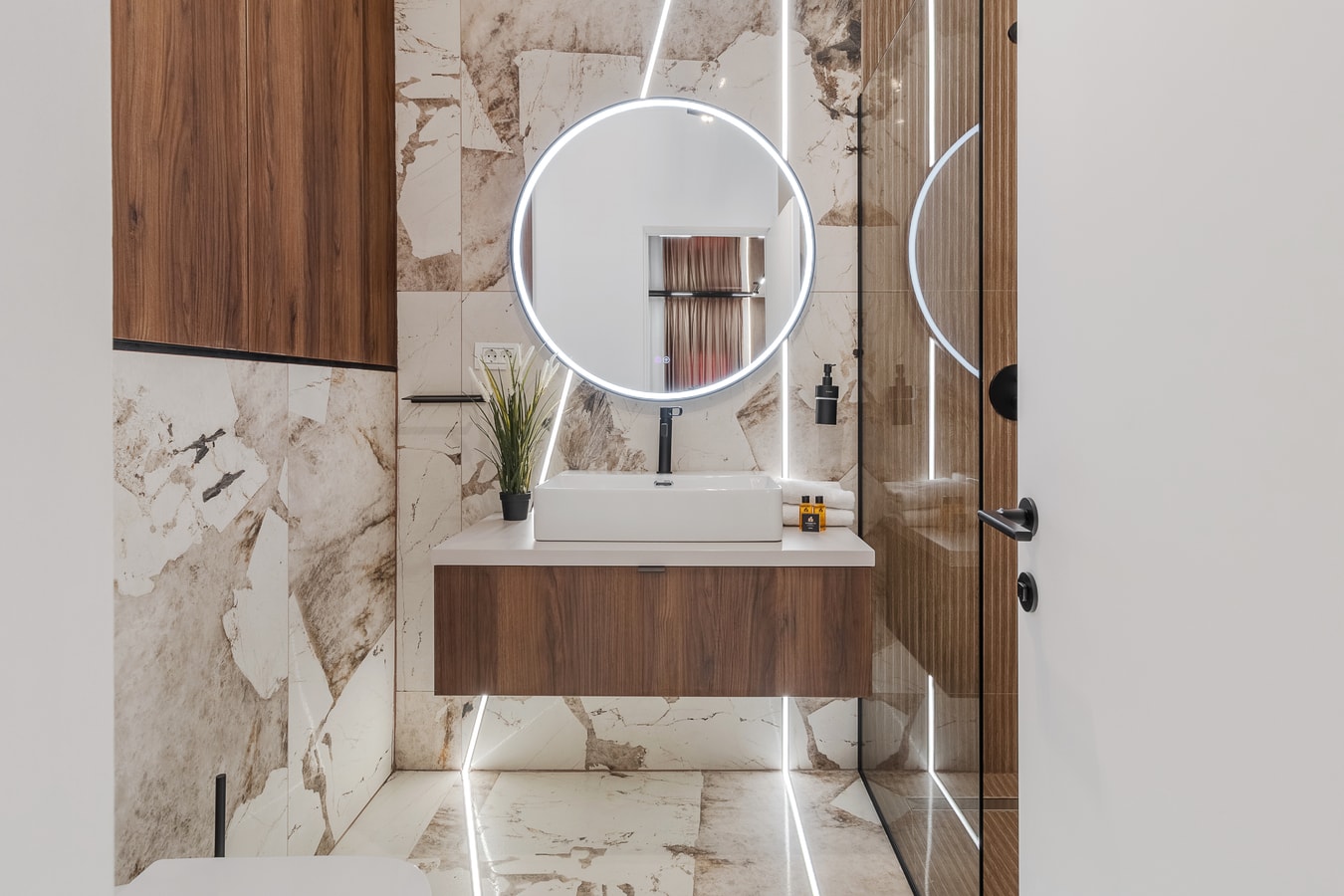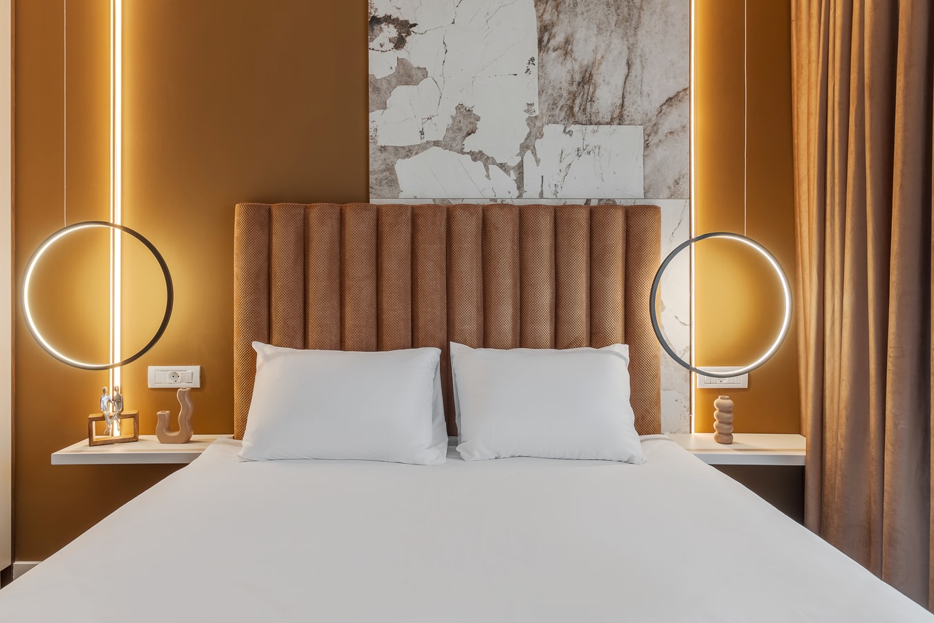 The bedroom combines rich textures and calming tones, with a comfortable double bed and soft lighting for a peaceful night’s rest. The bathroom features marble-inspired finishes, a walk-in shower, fresh towels, and essential amenities.
