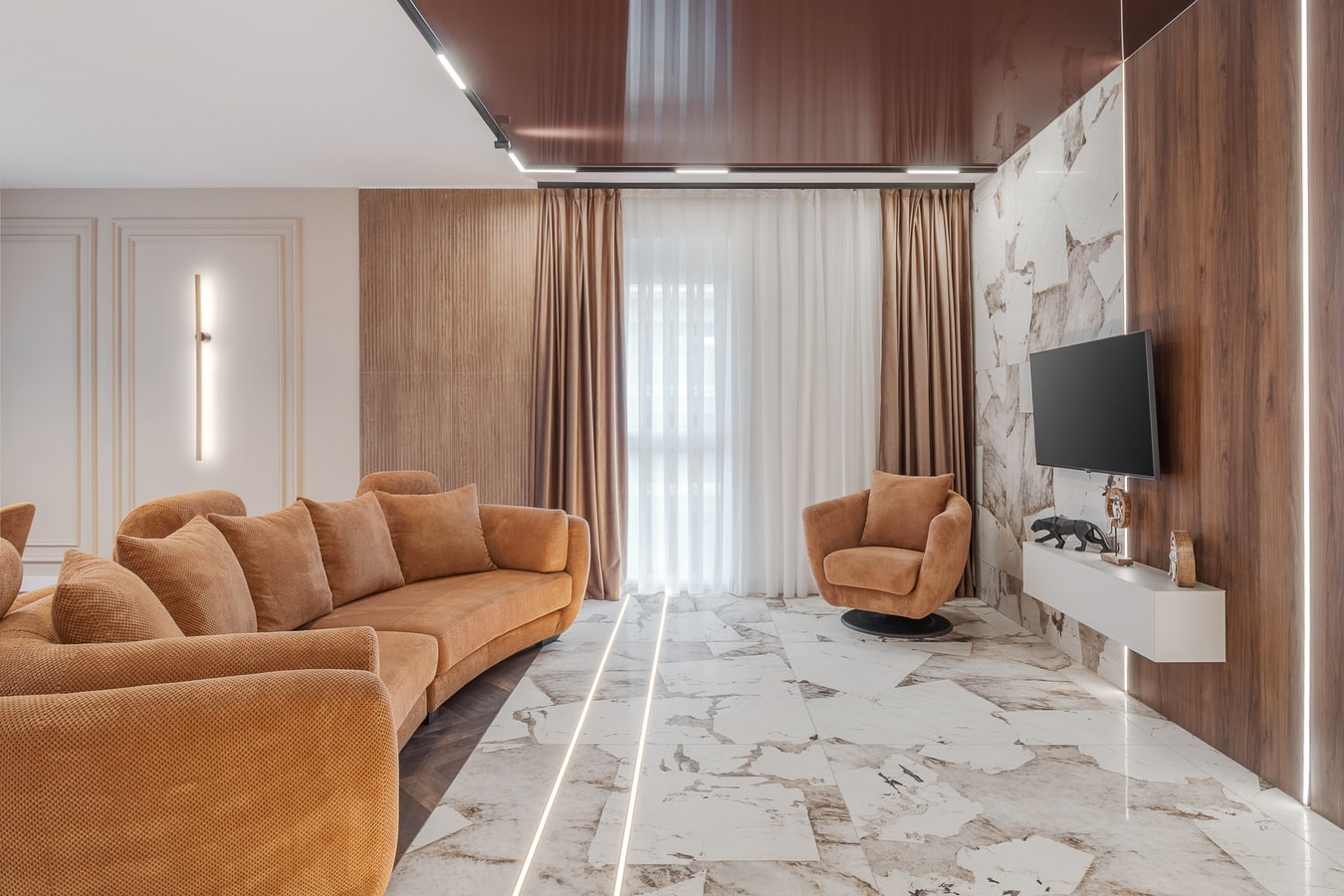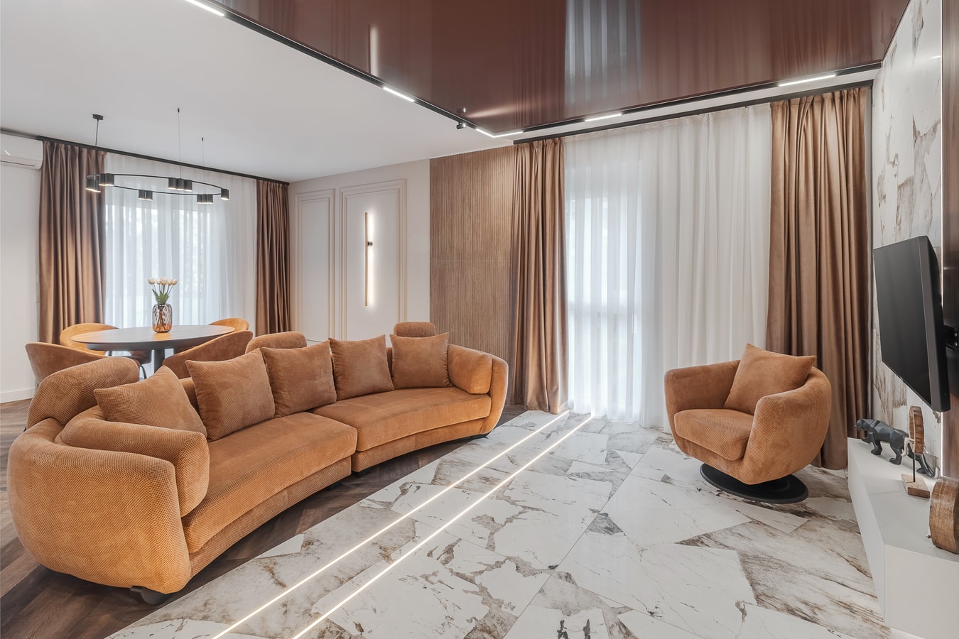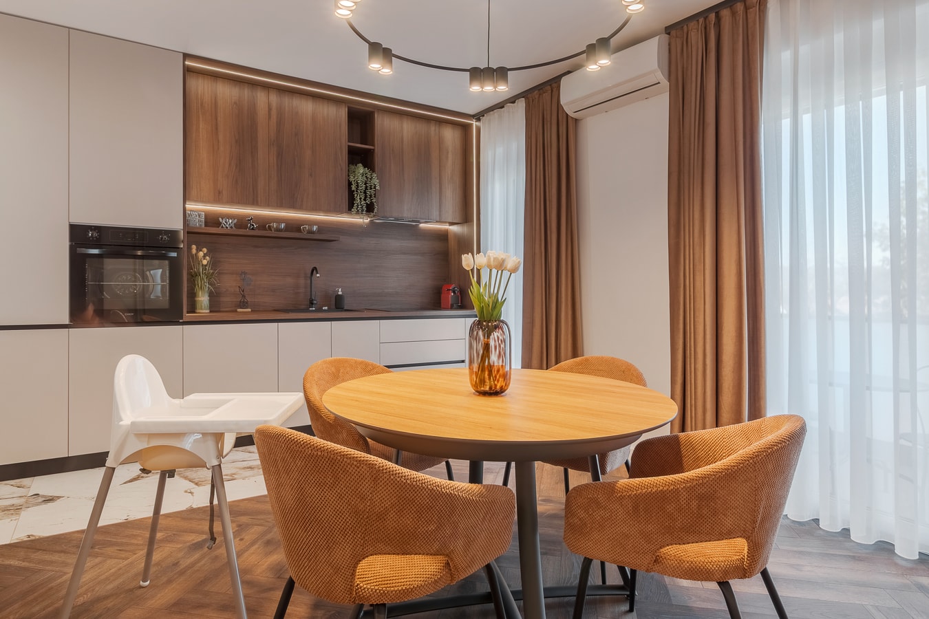 Step into a warm and inviting apartment where modern design meets natural elegance. The open-plan living area features a comfortable sofa, ideal for relaxing after a day in the city. Please note that the sofa is not suitable for sleeping.