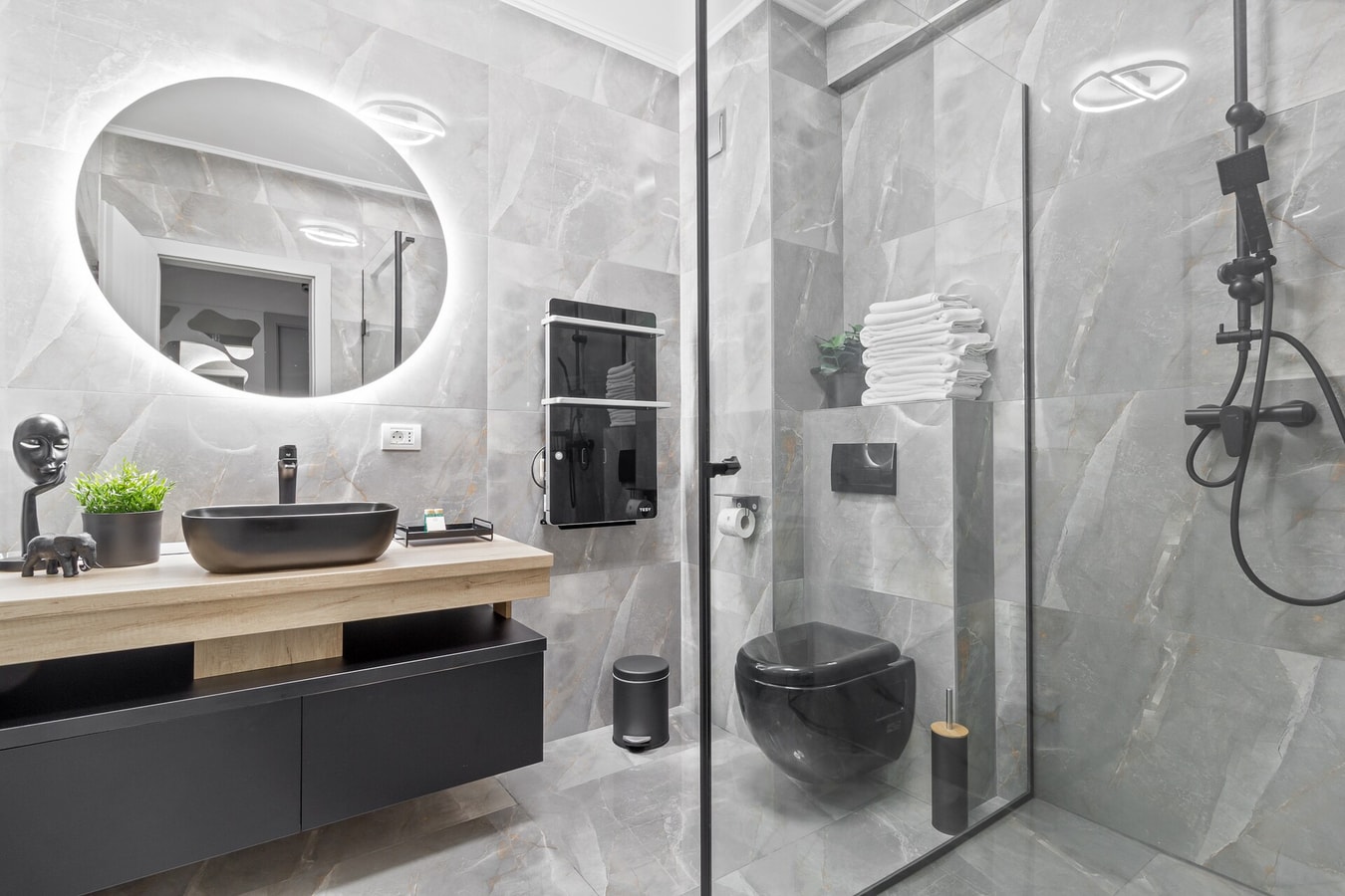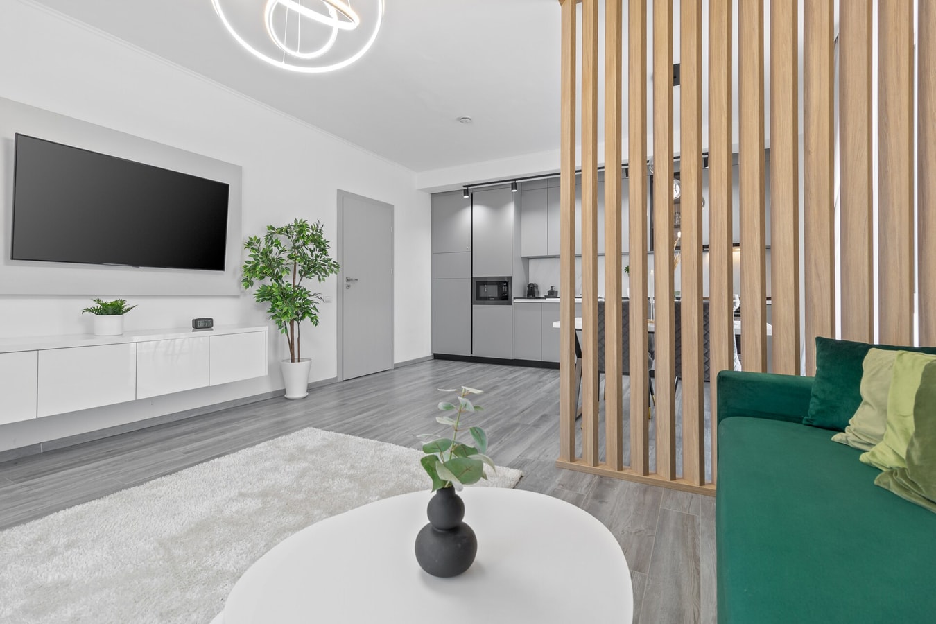 Step inside our warm and inviting flat, where modernity and comfort come together in a delightful ambiance with green accents and oak wood touches. The contemporary design, complemented by elegant wooden elements, creates a space that feels just like home.