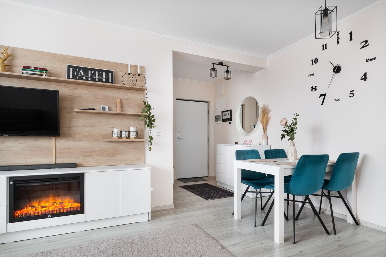 Step into our inviting space adorned with chic warm accents. Sink into the corner sofa and indulge in your favourite Netflix series or grab a book and enjoy it by the electric fireplace. Need extra space for guests? No worries, the sofa effortlessly transforms into a comfortable double bed for two.