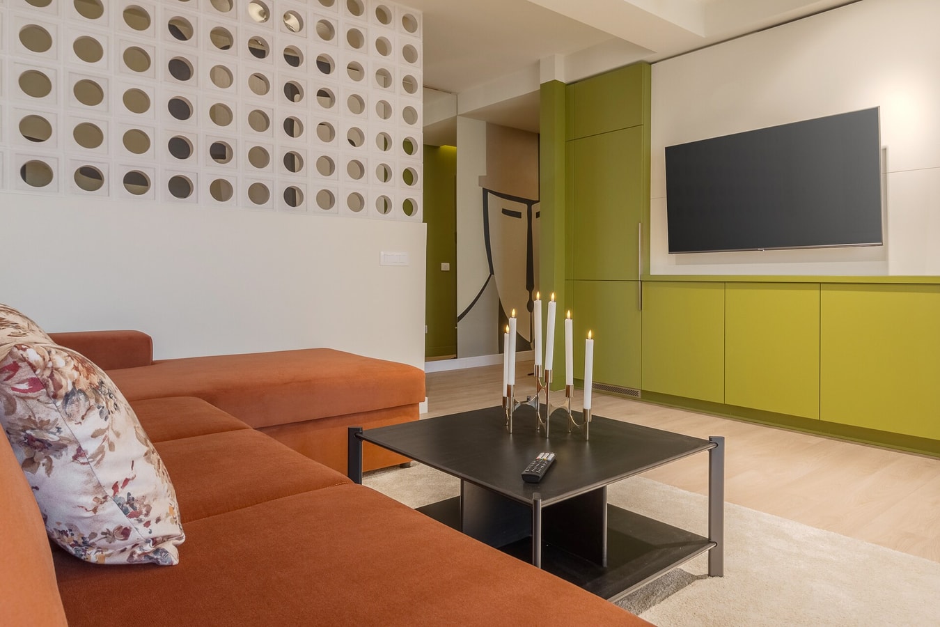 Living Room: Relax in the spacious living room, featuring a chic design with modern furnishings. The sofa bed provides additional sleeping space, making it versatile for your needs. Enjoy your favourite shows on a flat-screen TV while lounging with friends or family.