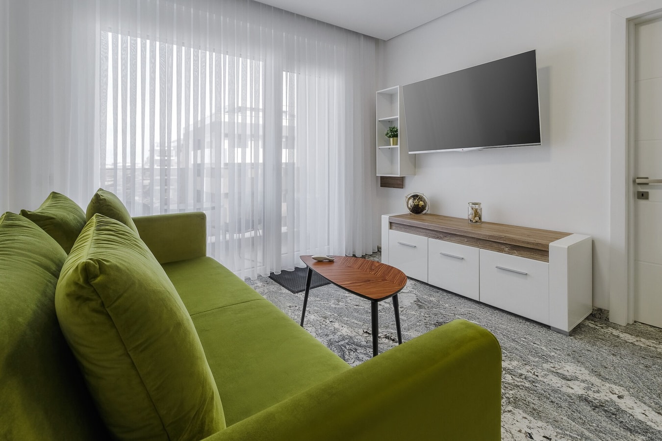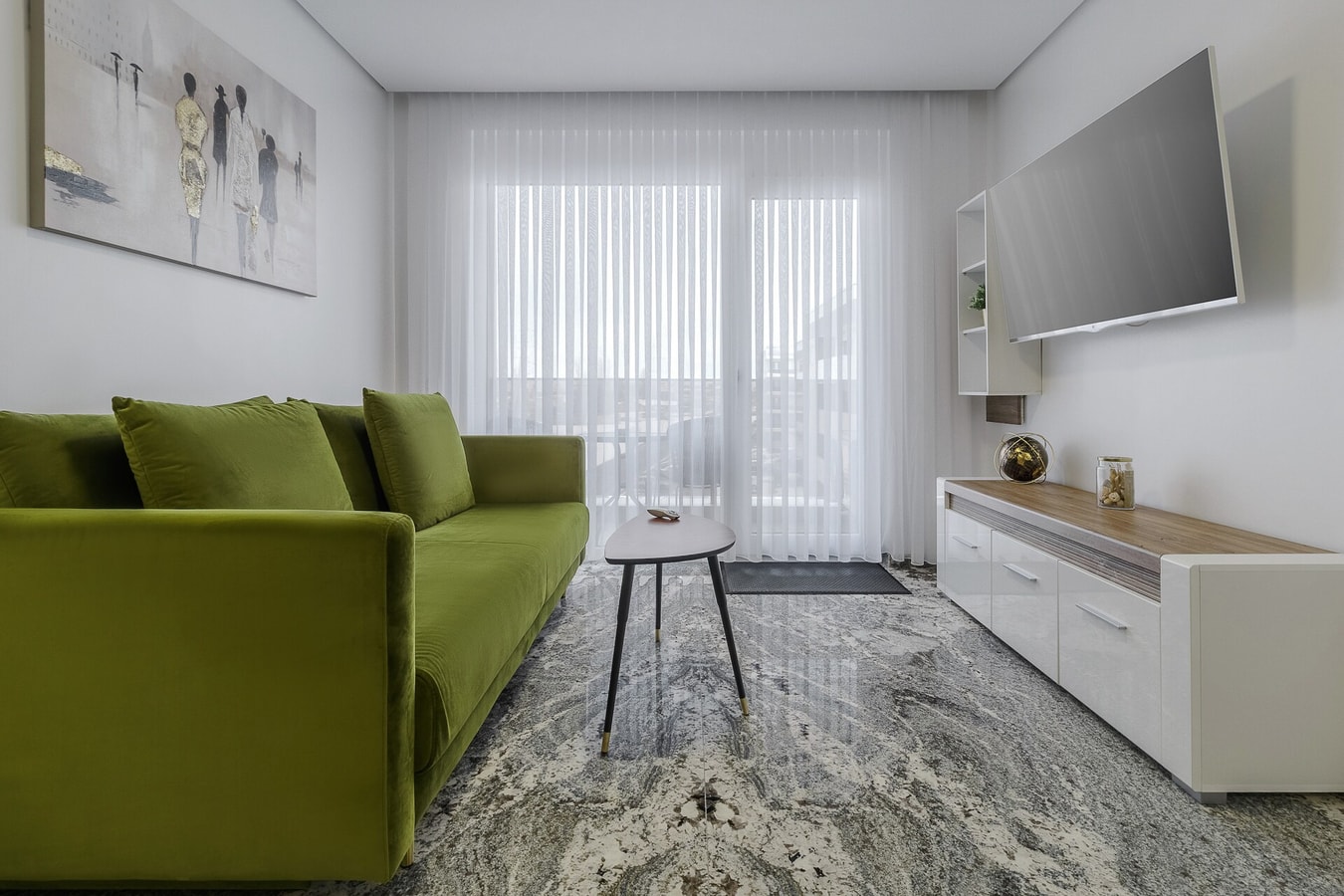 As you step inside, you’ll be greeted by a spacious living area adorned with natural marble stone tiles that lend sophistication to the space. The tastefully furnished living room is equipped with cozy seating, ideal for relaxing after a day of exploring the city.