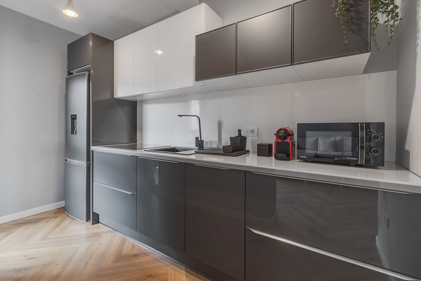 The fully equipped kitchen is perfect for both short and extended stays. It includes a stovetop, microwave, full-size fridge with freezer, toaster, and a Nespresso machine with complimentary coffee capsules. You'll find all the essentials to prepare light meals at home. The stylish dining nook comfortably seats four.