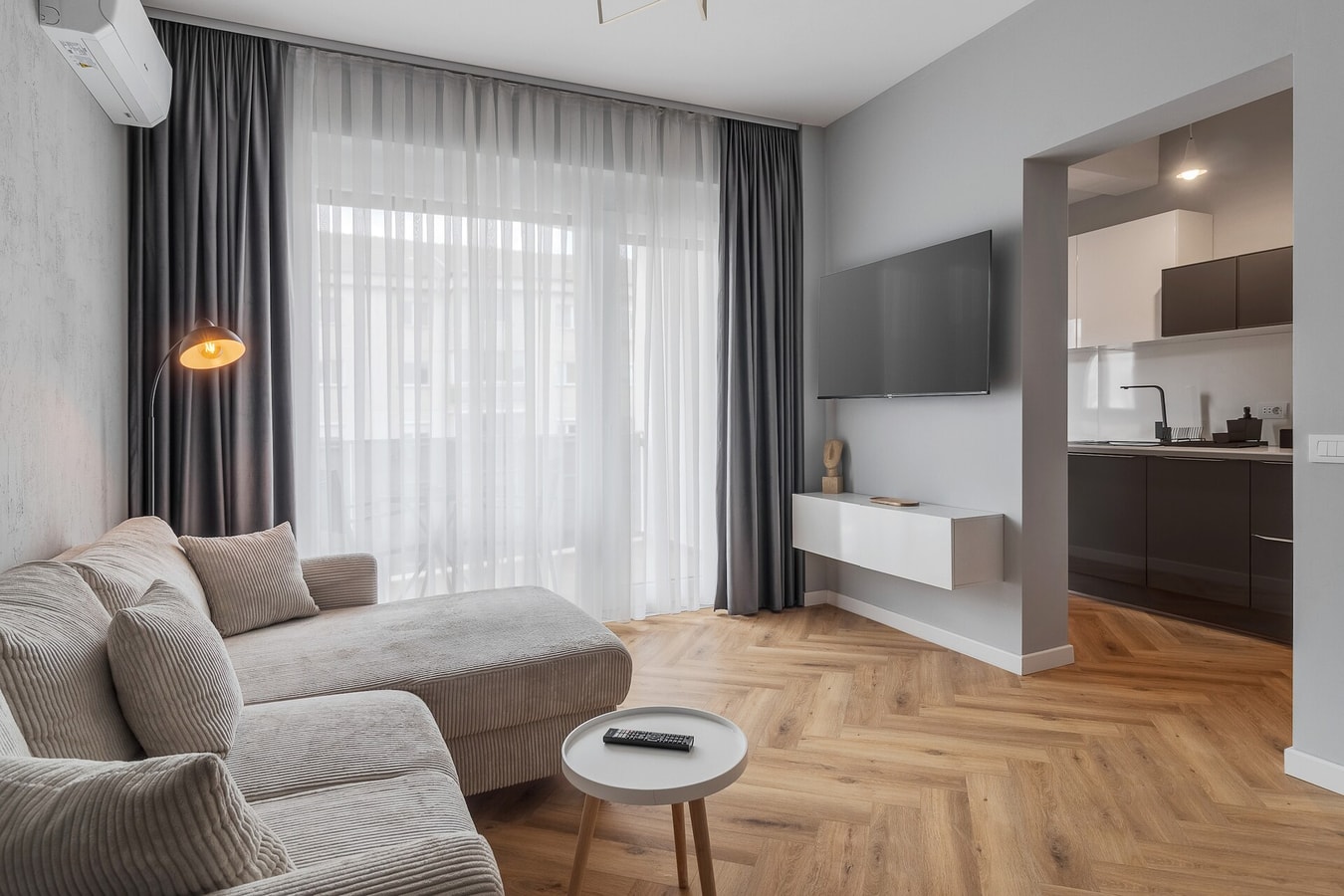 Step inside to an open-concept living space filled with natural light. The cozy living room features a soft L-shaped sofa, a smart TV with streaming access, and warm lighting that sets the mood for a relaxing evening. Slide open the doors to your private balcony, perfect for enjoying your morning coffee or unwinding with a glass of wine.