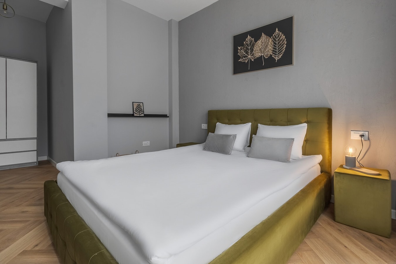 The bedroom is a peaceful retreat, featuring a luxurious velvet bed with a high-quality mattress, soft linens, and blackout curtains to ensure a great night's sleep. Golden leaf artwork adds a unique, natural touch and inspires the apartment’s name. There’s also generous storage space so you can settle in and feel at home.