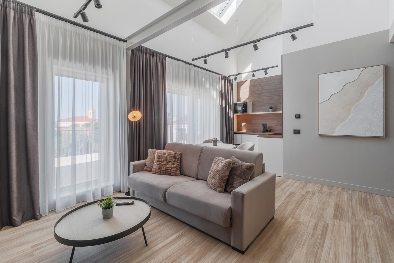 This modern, light-filled apartment blends luxury with comfort, featuring high ceilings, panoramic windows, and stylish, minimalist design elements throughout.