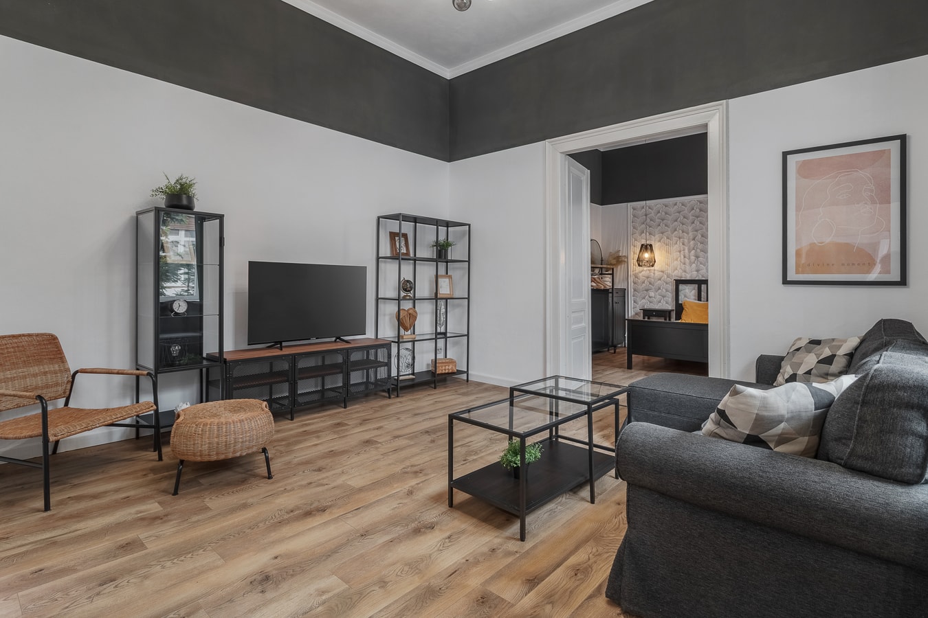 Spacious and stylish apartment featuring 2 bedrooms, 2 modern bathrooms, a cozy living room, and a fully equipped kitchen. Thoughtfully designed with natural accents and contemporary touches. Perfect for families or groups, offering both comfort and privacy. Located right on the pedestrian street, ideal for exploring the city. Wi-Fi, smart TV, washing machine, and everything you need for a relaxing stay!