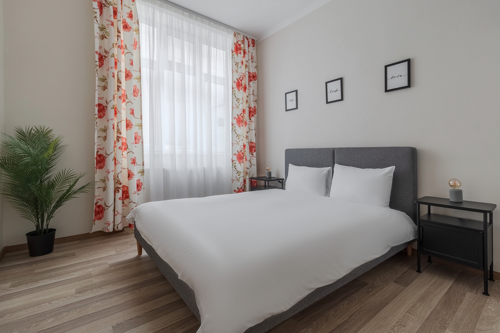 The apartment features one cozy bedroom with a comfortable double bed and soft lighting, ideal for restful nights.